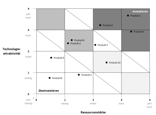 Mit dem Excel Tool Technologie Portfolio nach Pfeifer werden 10 Produkte nach der Technologie-Attraktivität und der Ressourcenstärke bewertet, um eine strategische Entscheidungshilfe für Investitionen zu erhalten.