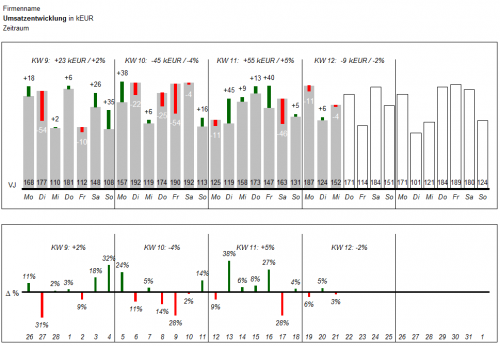 Die Abweichungswerte der Kalenderwochen werden Ihnen über den Säulen in Euro und Prozent angezeigt.