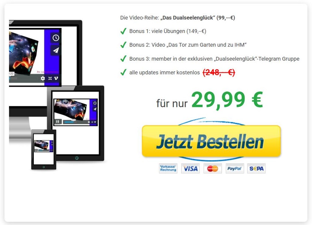 Füllen Sie jetzt unten alle benötigten Informationen aus und klicken Sie auf "Jetzt kaufen", damit Sie in dieser Video-Reihe die gesamten benötigten Schritte bekommen, die Sie brauchen, um in glücklicher Partnerschaft mit Ihrer Dualseele zu leben.