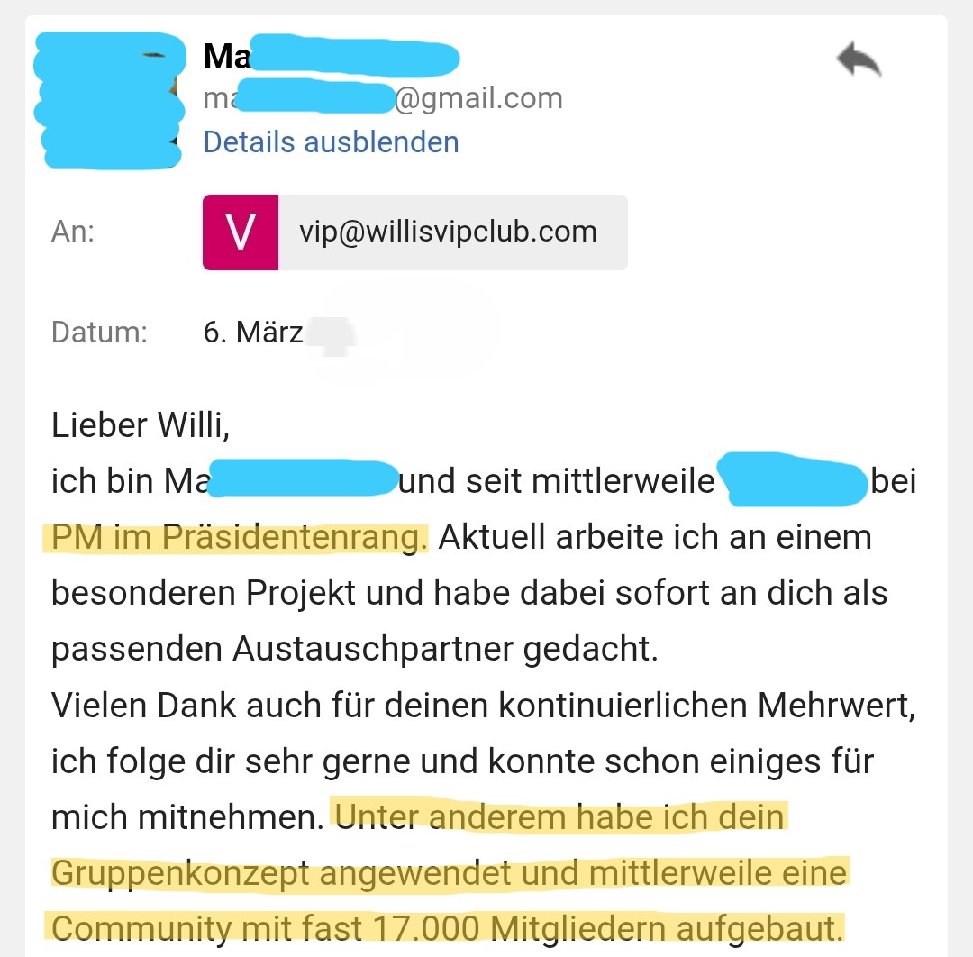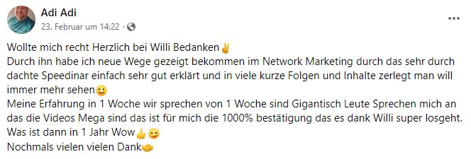 Eine 57-jährige Networkerin hat im ersten Monat 37 direkte Partner gewonnen – ohne ein einziges Posting, ohne eine einzige Nachricht. In den Monaten danach mindestens 18 Erstlinien pro Monat. Wie? Durch ihre besonderen Steckbrief-Einstellungen auf Facebook. Jedes Profil hat diesen Steckbrief – aber so nutzt ihn niemand. Ich habe ihre genauen Einstellungen vor mir. 3 Mausklicks. Maximal 4 Minuten. Die Anleitung ist so einfach gemacht, dass absolute Anfänger sie sofort umsetzen können. (Wert 99 €)