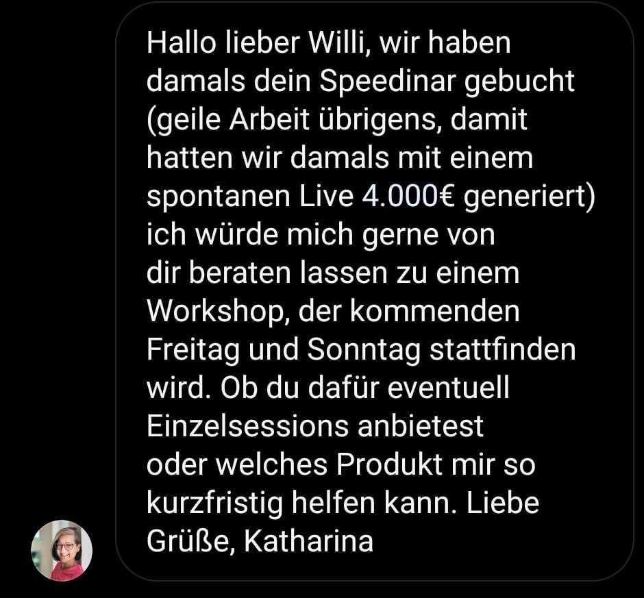 Das Ende der 3er-Calls und endlosen Termine. Du lernst, wie du neue Kunden und Partner direkt über Messenger-Gruppennachrichten abschließt – schnell, einfach und ohne Zeitverlust. (Wert 39 €)