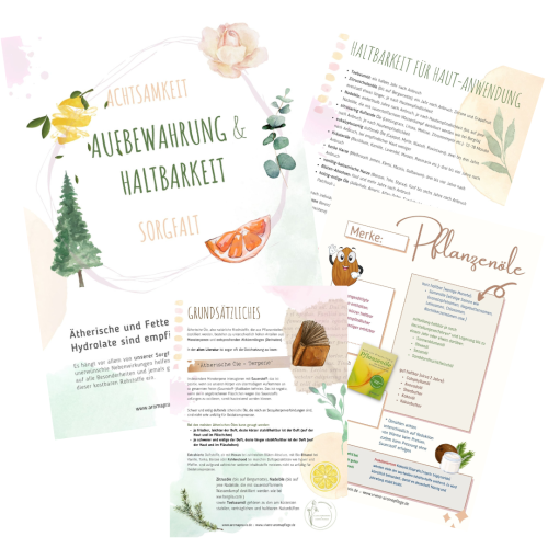 - ein 23 seitiges Skript im PDF-Format mit Informationen zu Haltbarkeit, Stabilität, Aufbewahrung und Verträglichkeit von ätherischen Ölen, fetten Pflanzenölen und Hydrolaten.