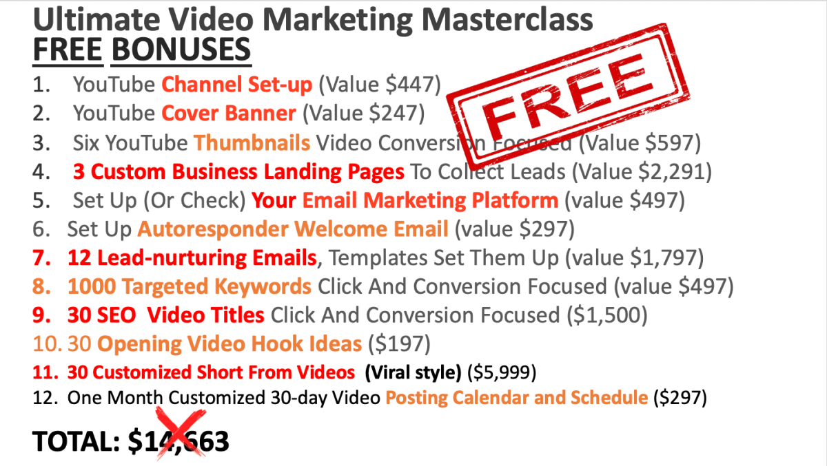 I understand that with today's investment I am entitled to receive 12 Digital Marketing BONUSES valued at $14,663 at no additional cost to me, all FREE with my purchase that comes with a unconditional 60-day money back guarantee.