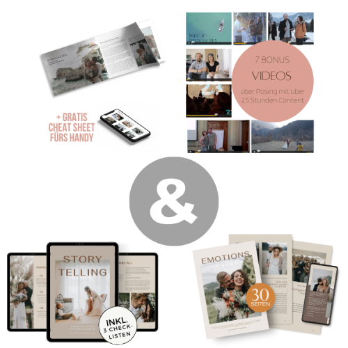 Hol dir unser MEGA Bundle: Storytelling, Emotions und Posing Guide, um Story, Gefühl, Pose – deiner Hochzeitsfotografie zu verbessern.