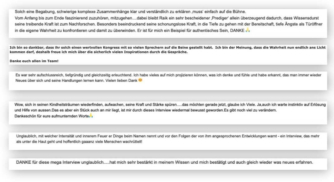 Das Thema ist jetzt hochbrisant und aktuell. Da ich schon viele Jahre diesen Weg sehr alleine gehe, ist dein Kongress für mich in der Coronazeit eine Oase, wo ich auftanken kann. Mich schon lange nicht mehr mit der Matrix verbunden zu fühlen, gibt mir jetzt wieder neue Energie, da ich bereits nach 2 Tagen dieses Kongresses mich selbst wieder mehr wahrnehmen kann. Und toll wie du die Interviews führst. Mit einer angenehmen, warmen Stimme und mit so viel Ruhe, wobei du deinen Gesprächspartner(in) sehr viel Raum lässt für Antworten. Und dabei stellst du auch noch die richtigen Fragen! Auch möchte ich das Technikteam loben. Ich habe sofort das Paket gekauft aber es war zuerst nicht möglich mit dem Kennwort im Login zu kommen. Ich wurde sehr schnell und gut unterstützt, sodass ich jetzt in Ruhe und zu meiner Zeit Zugriff auf alle Interviews habe. Vielen dank und viel Kraft für deine Arbeit!“
