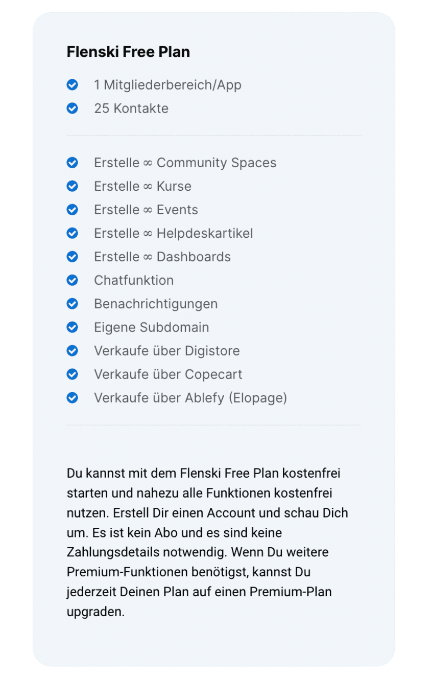 Du kannst mit dem Flenski Free Plan kostenfrei starten und nahezu alle Funktionen kostenfrei nutzen. Erstell Dir einen Account und schau Dich um. Es ist kein Abo und es sind keine Zahlungsdetails notwendig. Wenn Du weitere Premium-Funktionen benötigst, kannst Du jederzeit Deinen Plan auf einen Premium-Plan upgraden.
