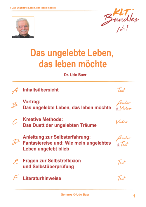 Am Beispiel des 1. Bundles zum Thema Das ungelebte Leben, das leben möchte, möchte ich Ihnen mein generelles Konzept kurz inhaltlich vorstellen. Es erwartet Sie neben der Inhaltsübersicht , einen Vortrag zum jeweiligen Thema von 30-40 Minuten, hier zum Thema: Das ungelebte Leben, das leben möchte, sowohl als Video als auch als Audio-Aufnahme. Die Kreative Methode meiner Wahl zu diesem Thema ist „Das Duett der ungelebten Träume“, die ich Ihnen im Video vorstelle. Meiner Anleitung zur Selbsterfahrung als Möglichkeit, einen persönlichen Zugang zum Thema zu finden, können Sie sowohl auditiv als auch in Textform folgen. Ebenso in Textform finden Sie sowohl die Fragen zur Selbstüberprüfung als auch die Literaturhinweise.
