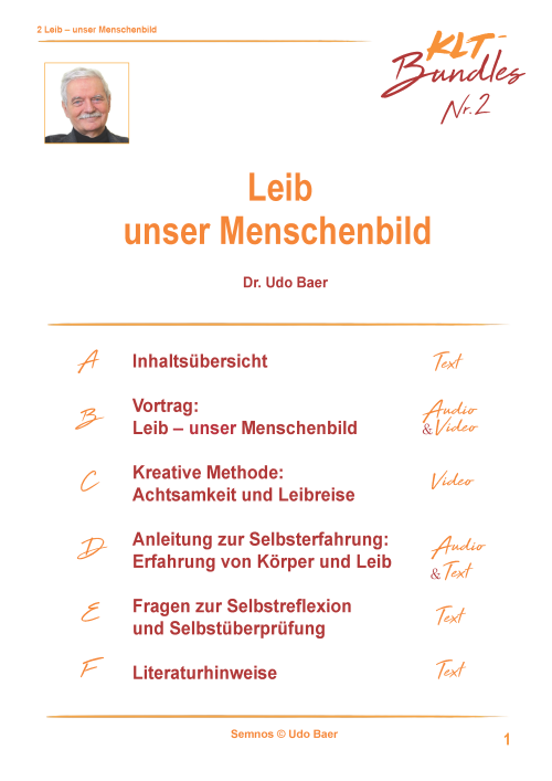 Es erwartet Sie neben der Inhaltsübersicht, ein Vortrag von 30-40 Minuten, hier zum Thema: Leib – unser Menschenbild, sowohl als Video als auch als Audio-Aufnahme. Die Kreative Methode meiner Wahl zu diesem Thema ist „Achtsamkeit", die ich Ihnen im Video vorstelle. Meiner Anleitung zur Selbsterfahrung als Möglichkeit, einen persönlichen Zugang zum Thema zu finden, können Sie sowohl auditiv als auch in Textform folgen. Ebenso in Textform finden Sie sowohl die Fragen zur Selbstüberprüfung als auch die Literaturhinweise.