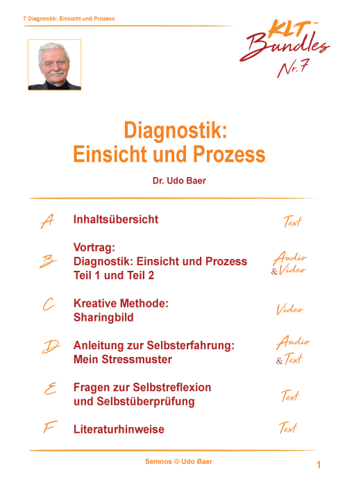 Es erwartet Sie neben der Inhaltsübersicht, ein Vortrag von 30-40 Minuten, hier zum Thema: Diagnostik: Einsicht und Prozess, sowohl als Video als auch als Audio-Aufnahme. Die Kreative Methode meiner Wahl zu diesem Thema ist „Mein Stressmuster", die ich Ihnen im Audio-Beitrag vorstelle. Meiner Anleitung zur Selbsterfahrung als Möglichkeit, einen persönlichen Zugang zum Thema zu finden, können Sie sowohl auditiv als auch in Textform folgen. Ebenso in Textform finden Sie sowohl die Fragen zur Selbstüberprüfung als auch die Literaturhinweise.