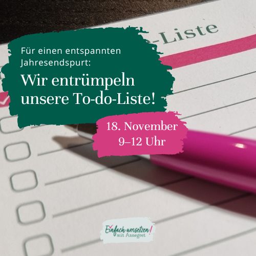 Deine To-do-Liste wird immer länger statt kürzer? Am 18. November entrümpelst du gemeinsam mit mir und anderen deine Liste und entscheidest bewusst: Was ist bis Jahresende wirklich dran? Was darf warten? Was kannst du loslassen – ohne schlechtes Gewissen?