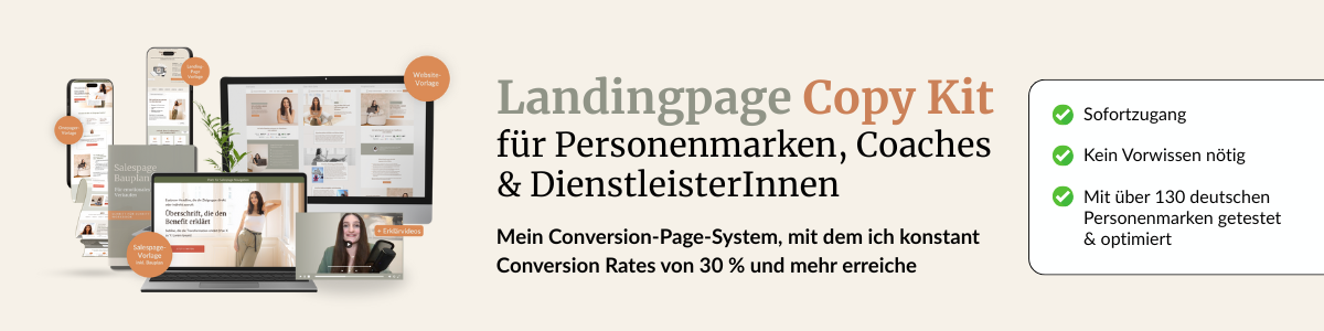 Mit dem Landingpage Copy Kit bekommst du mein Conversion-Page-System, mit dem ich konstant Conversion Rates von 30 % und mehr erreiche (Heißt: Jede dritte Besucherin wird Kundin oder schreibt sich ein.)