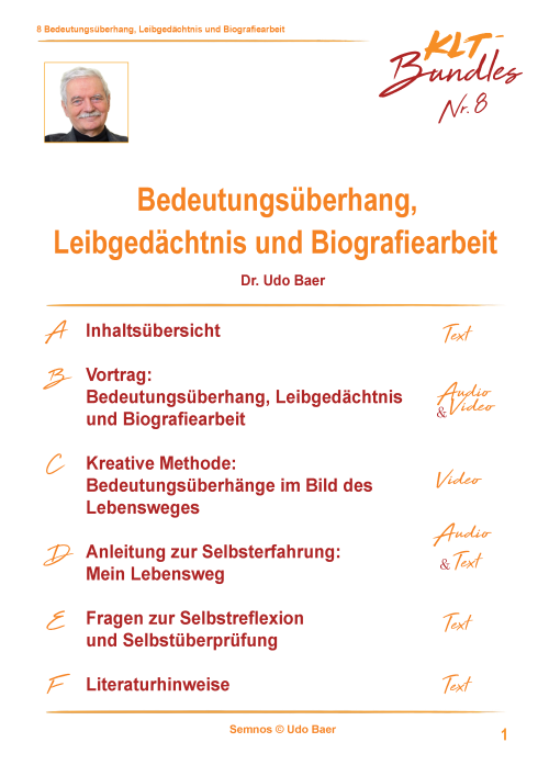 Es erwartet Sie neben der Inhaltsübersicht, ein Vortrag von 30-40 Minuten, hier zum Thema: Bedeutungsüberhang, Leibgedächtnis und Biografiearbeit, sowohl als Video als auch als Audio-Aufnahme. Die Kreative Methode meiner Wahl zu diesem Thema ist „Bedeutungsüberhang", die ich Ihnen im Audio-Beitrag vorstelle. Meiner Anleitung zur Selbsterfahrung als Möglichkeit, einen persönlichen Zugang zum Thema zu finden, können Sie sowohl auditiv als auch in Textform folgen. Ebenso in Textform finden Sie sowohl die Fragen zur Selbstüberprüfung als auch die Literaturhinweise.