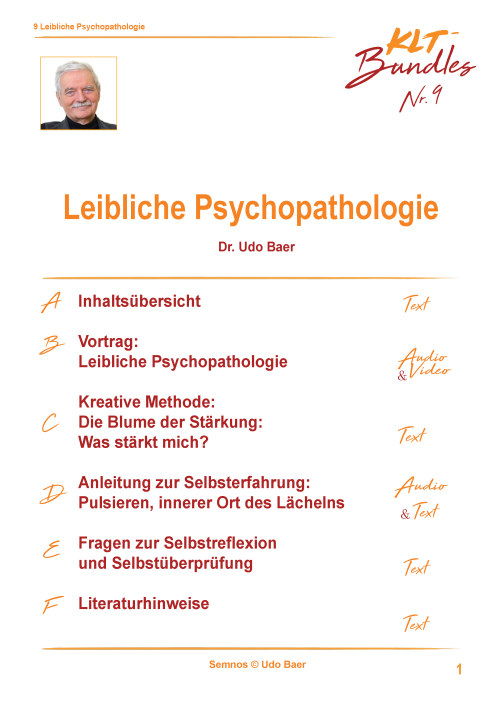 Es erwartet Sie neben der Inhaltsübersicht, ein Vortrag von 30-40 Minuten, hier zum Thema: Leibliche Psychopathologie, sowohl als Video als auch als Audio-Aufnahme. Die Kreative Methode meiner Wahl zu diesem Thema ist „Die Blume der Stärkung", die ich Ihnen im Audio-Beitrag vorstelle. Meiner Anleitung zur Selbsterfahrung als Möglichkeit, einen persönlichen Zugang zum Thema zu finden, können Sie sowohl auditiv als auch in Textform folgen. Ebenso in Textform finden Sie sowohl die Fragen zur Selbstüberprüfung als auch die Literaturhinweise.